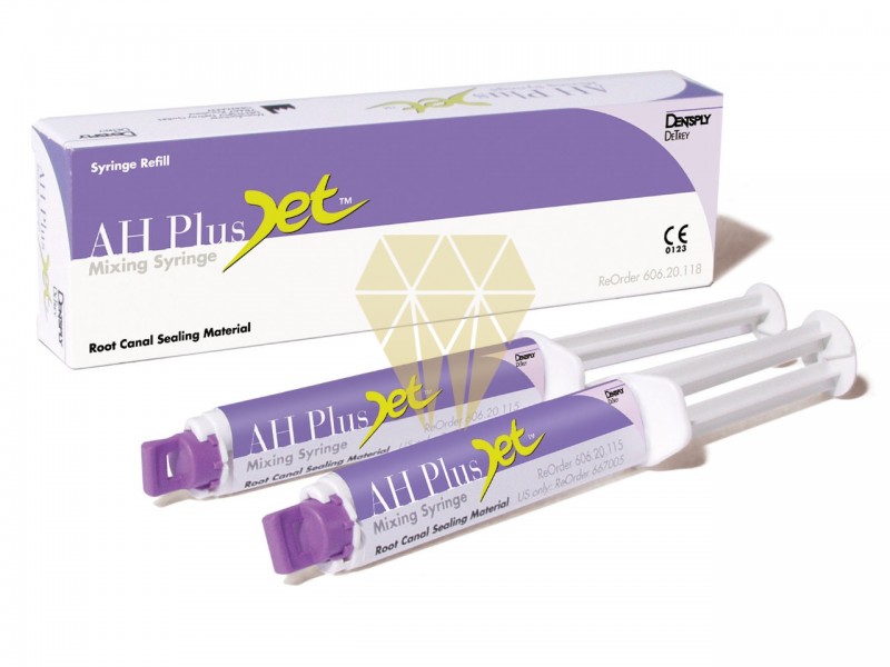 La jeringa de AH Plus Jet Mezcla se utiliza sobre todo como aplicación intra-oral directa, y ofrece una mayor precisión, comodidad y rapidez, además de no desperdiciar material. Es una resina para el sellado permanente de conductos radiculares a base de epoxi-amina. De manejo sencillo, excelentes propiedades físicas, baja contracción y solubilidad, alta biocompatibilidad, radiopaca. Presenta una adecuada fluidez y es apropiado para cualquier método con puntas, técnicas de condensación y guttapercha condensada con el calor. Contiene 2 jeringa Ah Plus Jet de 15 gr cada una.