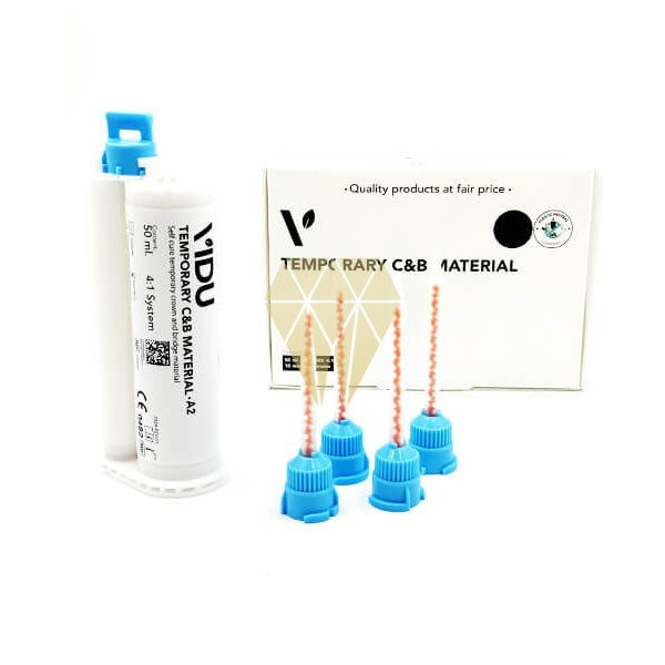 El Temporary C&B Material (Automix 4:1) de Vidu es un material bicomponente automezclable en cartuchos Automix a base de ésteres metacrílicos multifuncionales.