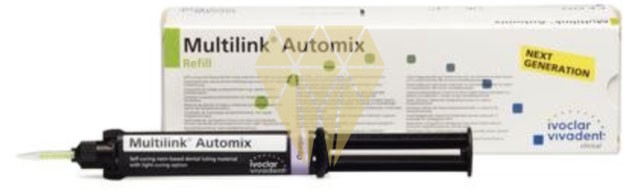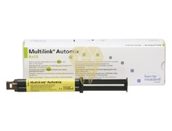 Este agregado de fijación autopolimerizable con opción de fotopolimerización es apropiado para cementación adhesiva de las reconstrucciones indirectas hechas en metal, cerámicas sin metal, cerámicas con metal y composites. Cementación de restauraciones indirectas (inlays, onlays, coronas, puentes, pernos endodónticos). Multilink Automix es un sistema adhesivo de cementación para restauraciones de cerámica de silicato y óxido-cerámica (p.e. IPS e.max), metal, metal-cerámica y composites. Amarillo. Envase de 9 gr.