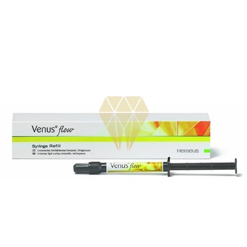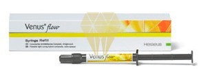 Venus Flow es un material tixotrópico que circula a nuestra voluntad. Posee una consistencia controlable con la mayor versatilidad. Tiene una elevada eficiencia estática con extraordinarias propiedades físicas. Es radiopaco, libera flúor, resistente a la abrasión y fluorescente. Se utiliza en el sellado de fisuras, en las reparaciones menores de restauraciones directas e indirectas, en ferulizaciones de dientes y obturaciones de cavidades, para fijar correctores dentales y para ajustes menores de contorno y de color en esmaltes y dentinas. Jeringa de 1,8 gr de color A3.