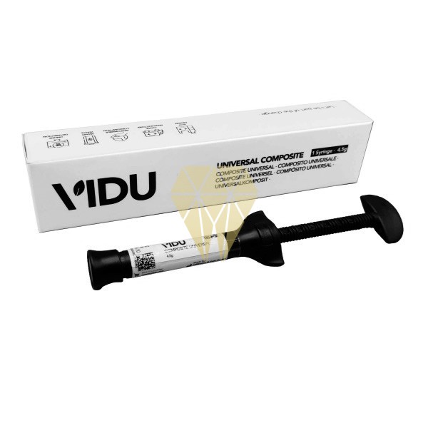 Composite universal microhíbrido y fotopolimerizable de la marca VIDU. Es altamente estético y está indicado para todas las clases de restauraciones. Muy susceptible al modelado, lo hace un material ideal para aplicar en técnica de múltiples capas, ya que garantiza un relleno totalmente natural y estético. Además, gracias a su polimerización, minimiza al máximo la contracción. También está indicado en tratamientos para carillas debido a su gran resistencia y excelente estética.