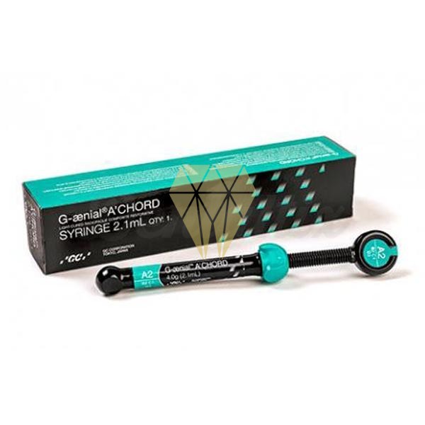 G-ænial® A'CHORD es un composite universal versátil para restauraciones en anterior y posterior, con un sistema de colores simplificado que logra la estética de los 16 colores clásicos Vita con sus 5 colores básicos (core). - Fluorescencia natural bajo cualquier tipo de luz gracias a su tecnología de relleno. - Consistencia ideal no pegajosa, esculpible en el sector posterior y pincelable en anterior. - Combina 3 tecnologías que le aportan alta resistencia, bajo desgaste, retención de brillo, baja decoloración y excelente radiopacidad.