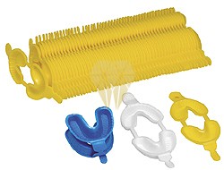 Cubetas desechables dobles para fluorización con mango y con la cara interior rugosa. Disponibles en tres tamaños (pequeño, mediano y grande). Cubeta doble grande azul. Dispensadas en bolsa de 50 pares de cubetas.