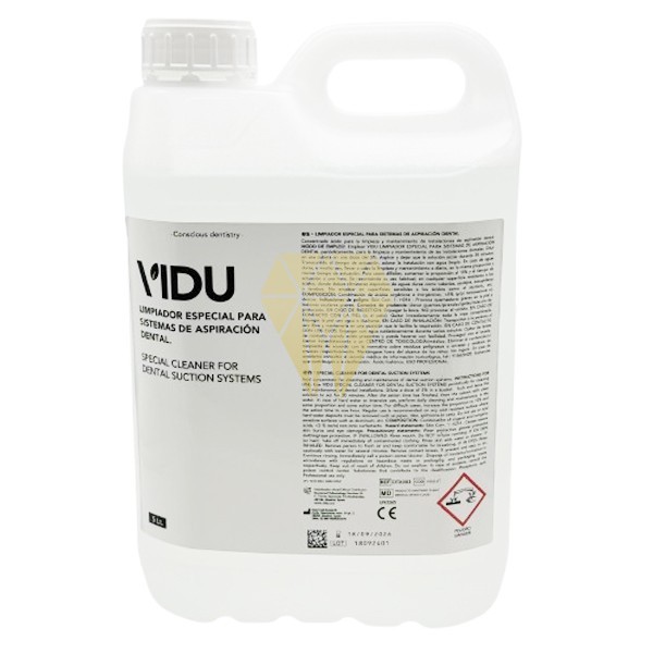El Limpiador para Sistemas de Aspiración de Vidu es un detergente concentrado para la limpieza de sistemas de aspiración y separadores de amalgamas de todo tipo. Características del Limpiador para Sistemas de Aspiración Dental: - Elimina mal olor, sin espuma y biodegradable. - Protege las aspiraciones y conductos. - Limpiador descalificador que deshace depósitos de cal. - Vida útil de 3 años. - Utilizar 1 o 2 veces por semana (en caso de mucho uso del sistema se puede usar a diario). - Tiempo de actuación de 30 minutos. - Compuesto por ácidos orgánicos (15 - 30%), ácido fosfórico (15 - 30%), tensioactivos sin espuma (5 %) y adyuvantes en solución acuosa. - Contenido: 1 bote de 1 o 5 litros. LIMPIADOR PARA SISTEMAS DE ASPIRACIÓN · PLASTIC NEUTRAL CERTIFIED · HUELLA DE PLÁSTICO CERO En el caso del limpiador y el plástico generado por la misma, mientras VIDU trabaja en la investigación de soluciones alternativas que permitan mantener el producto en las condiciones necesarias, han llegado a un acuerdo con RePurpose, organización que ha desarrollado la mayor red certificada de proyectos de recogida de plástico en todo el mundo, según el cual recolecta a través del proyecto Nuevo Ciclo, en Colombia, la misma cantidad de plástico que la que generan.