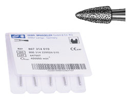 fresas de diamante y carburo-tungsteno de alta calidad. Acabado muy uniforme, de bajo desgaste y duración muy superior a otras marcas (2-3 veces más). Eliminación de restos mejorado y optimas propiedades de enfriamiento. Tipos de Turbina, Contra-ángulo y Pieza de mano.Caja de 6 unidades.