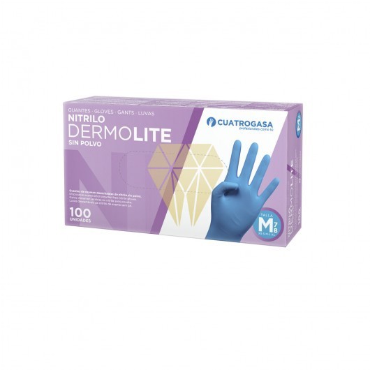 Guante de examen de nitrilo Dermolite, sin polvo, color azul, desechable, marca Cuatrogasa.