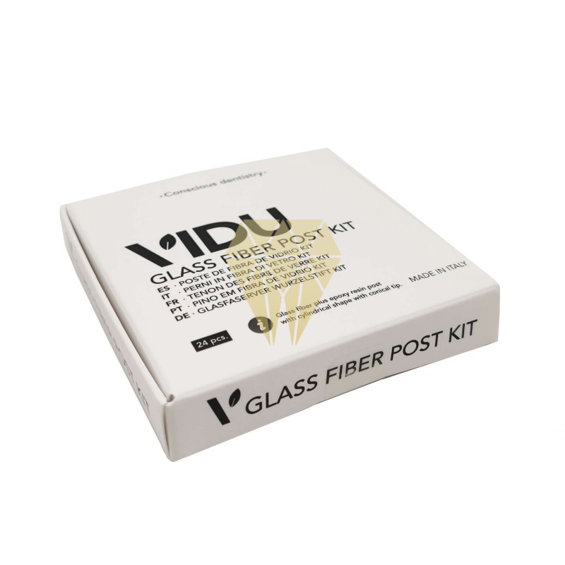 Los postes de fibra de vidrio VIDU son de forma cilíndrica y punta cónica. Están indicados para dientes con una moderada cantidad de tejido coronal residual y canales con secciones pequeñas.
