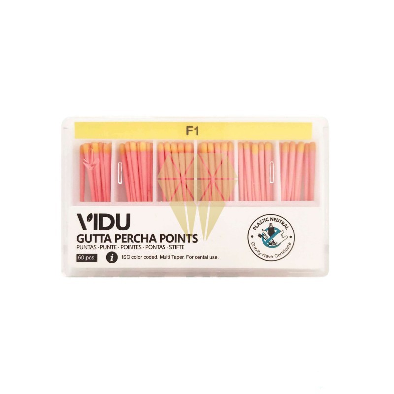 Las Puntas de Gutapercha Dental de Vidu de Conicidad Múltiple son compatibles con el sistema Protaper, Protaper Next y Gold. Presentan alta flexibilidad y rigidez, para proporcionar una capacidad de trabajo ideal. Son fabricadas a mano con gutapercha de la más alta calidad y con una tolerancia muy ajustada. Las puntas de guttapercha VIDU facilitan la obturación en frío haciéndola rápida y precisa y sólo es necesario el uso de un cono de gutapercha.