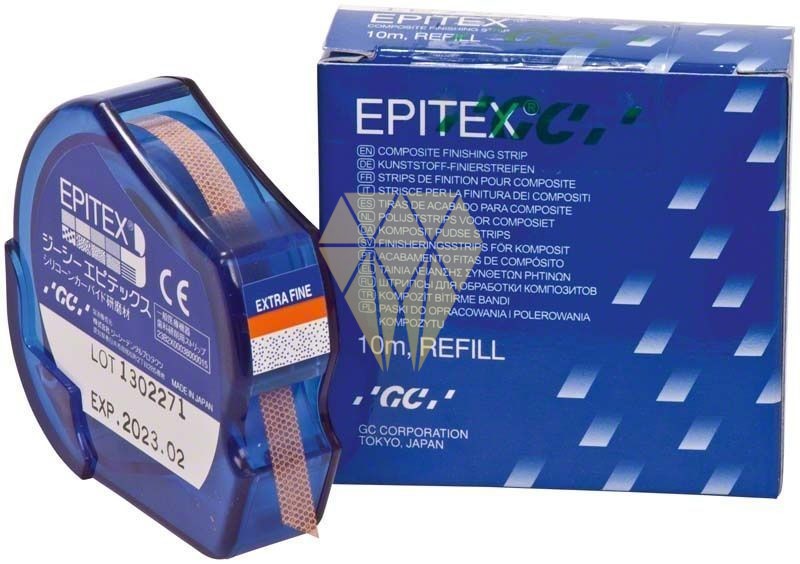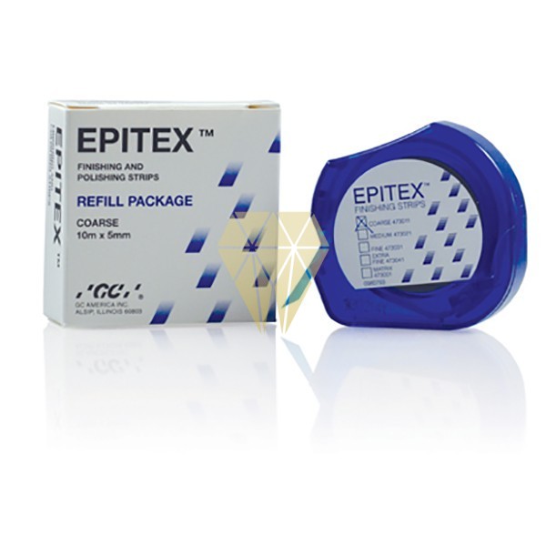 Tiras de acabado y pulido. Fácil contorneado, acabado y pulido en espacios interproximales, apropiado para cementos de ionómero de vidrio y composite. Material flexible y extremamente fino. Muy resitente al desgarro. Las partículas abrasivas están firmentente incrustadas en la superficie de la tira. Cuatro grados de granulados. Dispensador manual de tira. Presentación: recambio 10 M.