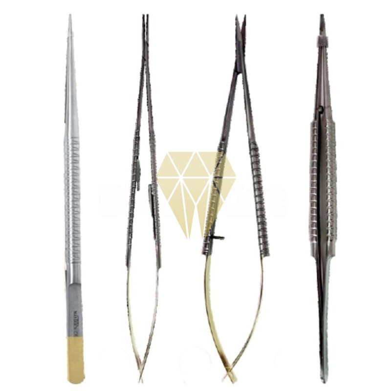 - Porta agujas, tipo Castroviejo, fino y ligero con agarre estríado para mayor comodidad. Acero inox con parte activa fina y estriada reforzada con tungsteno.