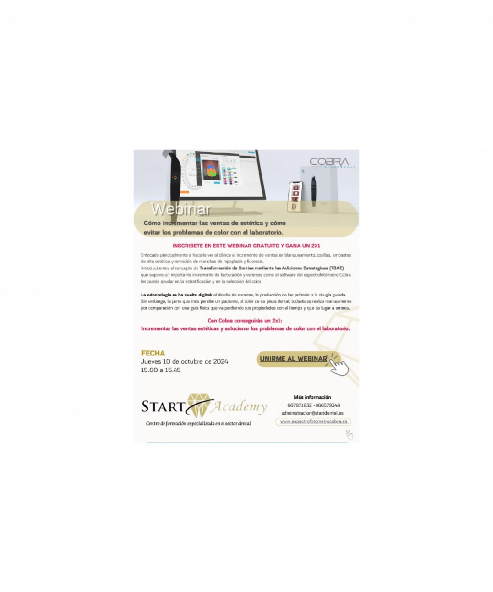Introduciremos el concepto de Transformación de Sonrisa mediante las Adiciones Estratégicas (TSAE) que supone un importante incremento de facturación y veremos como el software del espectrofotómetro Cobra les puede ayudar en la estratificación y en la selección del color