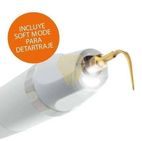 Detartrador integrado con pieza de mano led. Compact piezo LED cubre un amplio rango de indicaciones, desde detartraje en tratamientos de periodontitis y limpieza de implantes, hasta restauración y todo tipo de tratamientos endodónticos. - Incluye Soft Mode, para pacientes con alta sensibilidad. - Luz orientable. Evita sombras en los insertos. - Dotación de 4 insertos.
