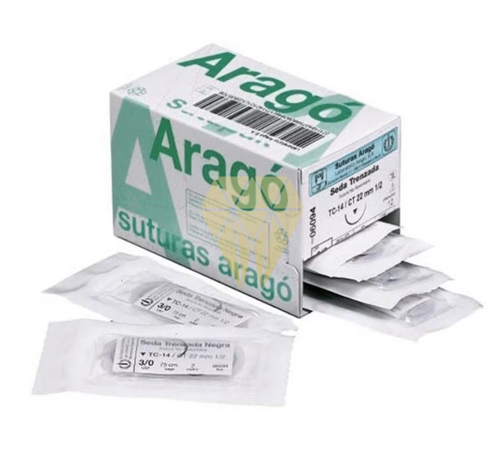 El hilo de sutura seda está fabricado de seda natural trenzada recubierto de una mezcla de cera y silicona. Esta esterilizado con rayos gamma, tienen una fácil anulidad, alta firmeza y no son absorbibles. Hilo TB 12 con hebra USP 3/0. Caja con 12 unidades.