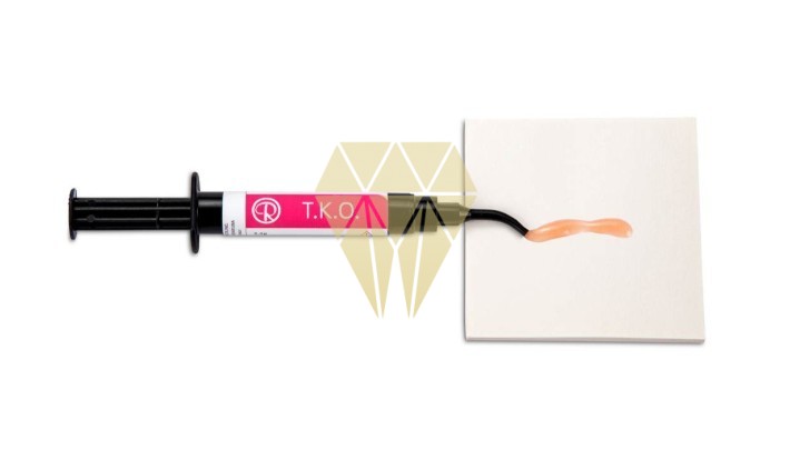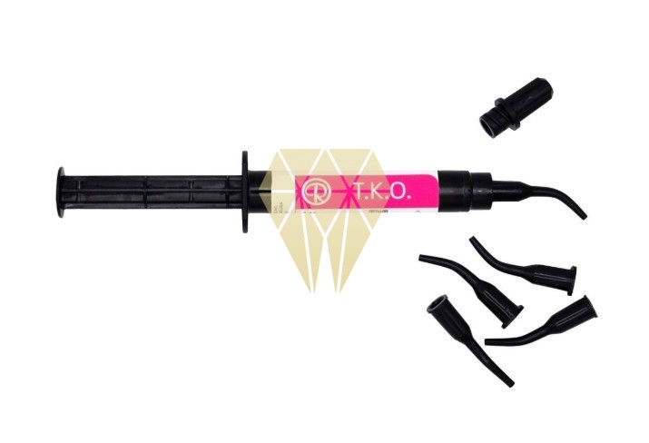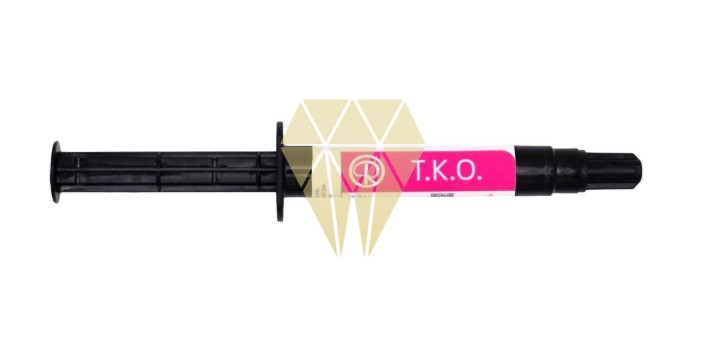T.K.O.® de Reliance® Orthodontics es una pasta de composite fotopolimerizable, tipo gel, color rosa con mucha fuerza y con un módulo bajo de elasticidad. T.K.O.® se utiliza para tanto laboratorios como clínicas.Especialmente útil para: Reparaciones de aparatos acrílicos, levantamientos de mordida (oclusales), rampas Bite Turbo. Resistente a la erosión en piezas la arcada antagonista. Una resina de fotopolimerización blanda para la comodidad del paciente. Viscosidad óptima. Puntas desechables precisas. Color rosa para una localización y limpieza fácil.