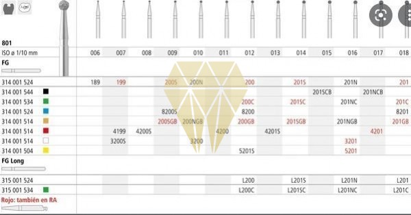 fresas de diamante y carburo-tungsteno de alta calidad. Acabado muy uniforme, de bajo desgaste y duración muy superior a otras marcas (2-3 veces más). Eliminación de restos mejorado y optimas propiedades de enfriamiento. Tipos de Turbina, Contra-ángulo y Pieza de mano.Caja de 6 unidades.