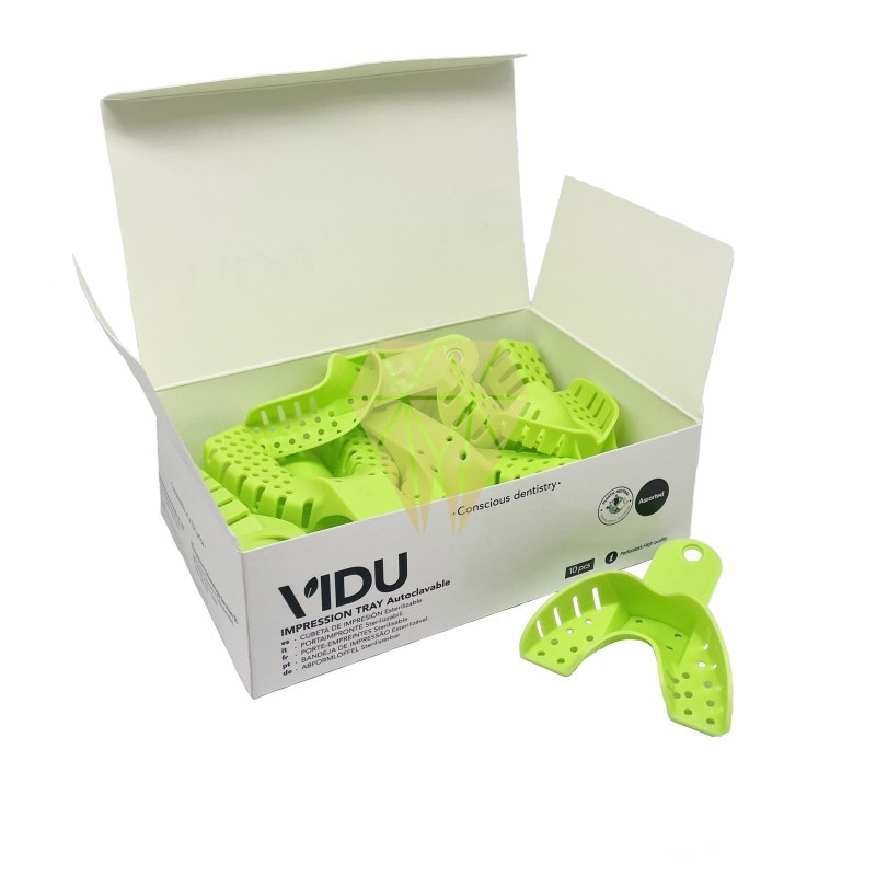 Las cubetas de impresión esterilizables de VIDU están fabricadas en plástico rígido, perforadas, con bordes lisos para la comodidad del paciente, son duraderas e ideales para la toma de impresiones dentales.