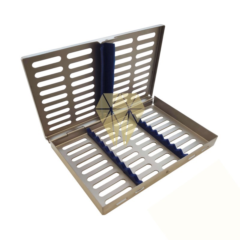- Casete de esterilización con ranuras personalizadas para colocar instrumentos dentales.