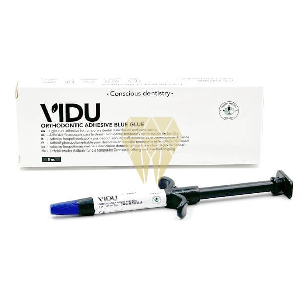 El adhesivo Blue Glue de Vidu es un adhesivo de ortodoncia fotocurable para la desoclusión dental temporal y cementación de bandas. Contiene colorantes para facilitar la visualización del producto durante su aplicación y eliminación.