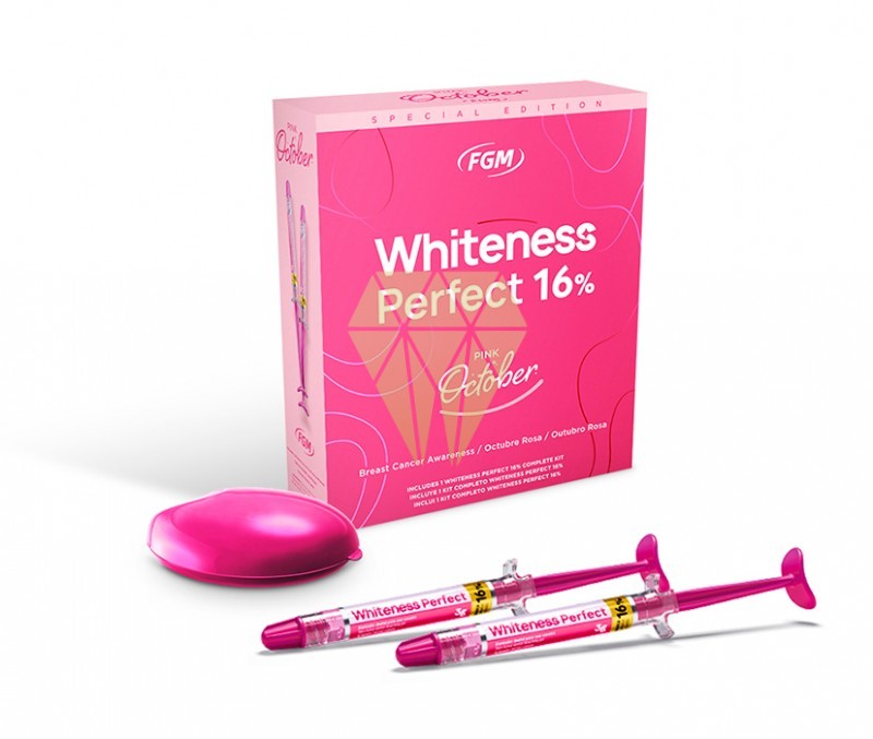 Blanqueamiento de casa Whiteness Perfect, edición especial de campaña contra el cáncer. Parte de lo recaudado irá para la AECC para la investigación en esta enfermedad. Catalogado por Dental Advisor como el mejor blanqueamiento dental para casa durante 5 años consecutivos, Blanqueador dental a base de peróxido de carbamida al 16% para el tratamiento casero supervisado. Nitrato de potasio y fluoruro de sodio como agentes desensibilizantes, Ph neutro.Doble acción desensibilizante: Acción neural del nitrato de potasio y oclusiva del fluoruro de sodio. El nitrato de potasio es un agente efectivo en el tratamiento de la dentina hiperestésica. Su acción se basa en el hecho de que el aumento de la acción neural del nitrato de potasio y oclusiva del fluoruro de sodio. Su acción además, se basa en el hecho de que el aumento de la concentración del potasio extracelular despolariza las membranas de las fibras nerviosas, bloqueando el paso del estímulo, reduciendo la hipersensibilidad. Excelente viscosidad: No escurre en de la férula. Alto rendimiento: Cada jeringa sirve para una media de 7 a 9 aplicaciones. Tiempo de uso recomendado: 16%: 3 a 4 horas o uso nocturno.