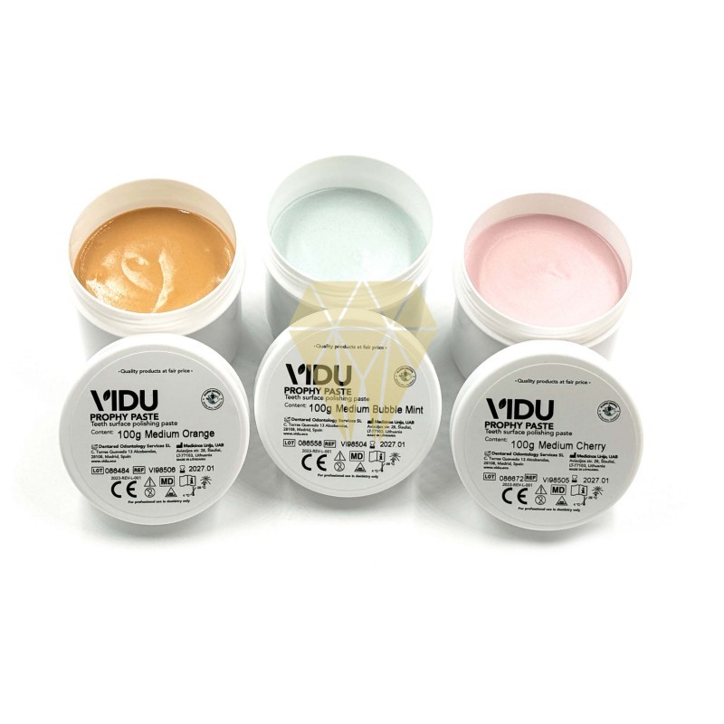 La pasta de profilaxis de Vidu se utiliza para limpiar, preparar la superficie o recontornear, terminar y pulir. Está disponible en distintos formatos y sabores.