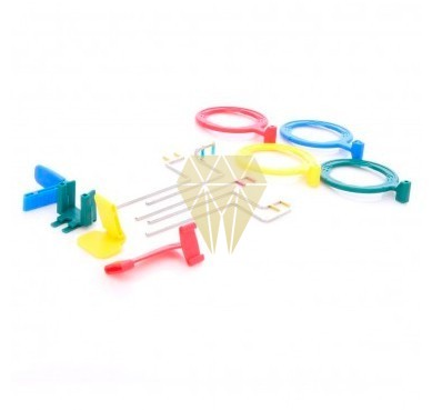 Este completo Kit Posicionador Radiográfico incluye 5 brazos, 5 anillos, y 19 bloques de mordida: 4 anterior (azul), 8 posterior (amarillo), 5 de bitewing (rojo) y 2 endo (verde).