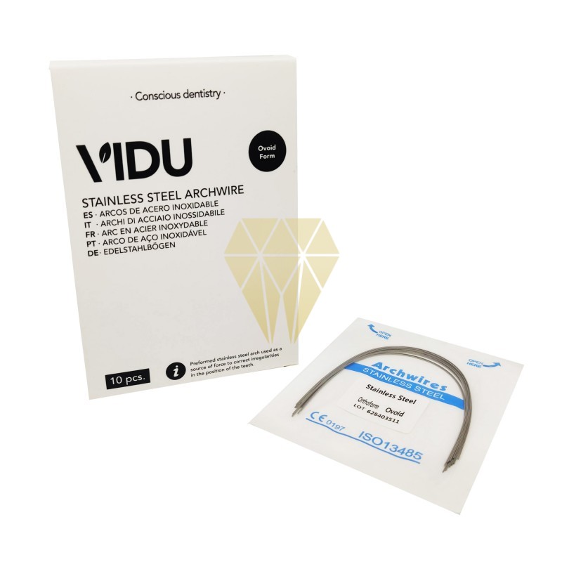 Los Arcos de Acero Inoxidable VIDU están fabricados con el sistema High Polish de pulido especial para reducir la fricción y mejorar el deslizamiento en la ranura del bracket (slot). Los Arcos de Acero Inoxidable VIDU vienen en forma Natural y Ovoide en todas las medidas superior e inferior. VIDU dispone de una amplia gama de productos en su línea de ortodoncia, productos de la más alta calidad que ofrecen un rendimiento predecible e incomparable.