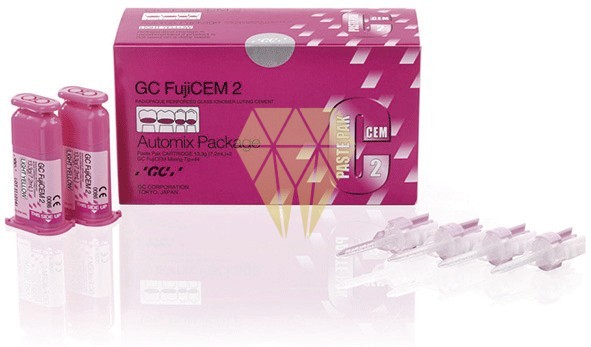 Cemento de ionómero de Vidrio reforzado con resina. Fujicem 2 SL con el sistema SLIDE & LOCK se beneficia de las siguientes características: altas propiedades físicas, alta fuerza de unión gracias a la innovadora tecnología de Force & Fusion que le permite actuar como un amortiguador, lo que garantiza una retención duradera de sus restauraciones. Cómodo manejo, gracias a su dispensador o bien metálico o de plástico. Versátil, permite usarse en modo manual o de automezcla gracias a las puntas dispensadoras de fácil colocación.