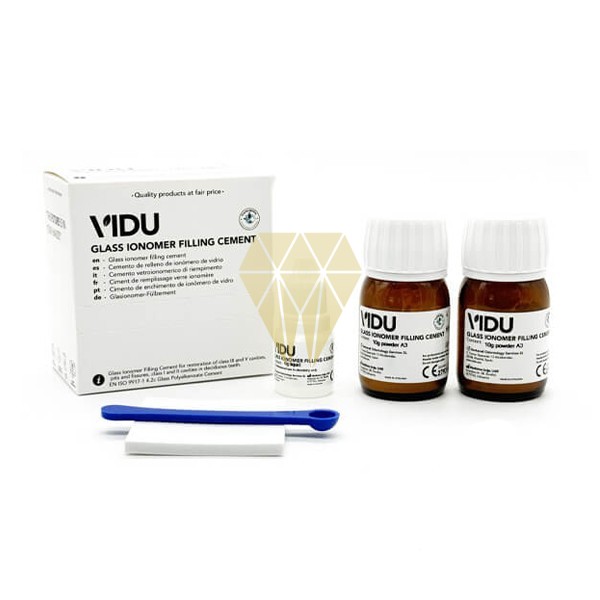El ionómero de vidrio para restauraciones de Vidu es un cemento estético, bioinerte, de curado químico y de fraguado rápido con excelente expansión térmica.