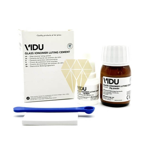 El ionómero de vidrio para cementar de Vidu es un cemento fijador de ionómero de vidrio bioinerte, de curado químico, con alta adherencia a dentina, esmalte y aleaciones no preciosas.