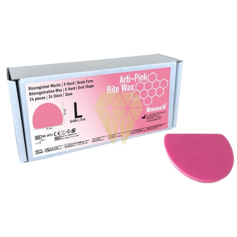 Se utiliza para un registro preciso permitiendo la reproducción exacta de los contornos en la intercuspidación. Se caracteriza por sus excelentes propiedades de modelado. Con un espesor de 3 mm, esta cera extra-dura en forma ovalada tamaño L. Para utilizar Arti-Pink Bite Wax, caliente la cera extra-dura en agua caliente hasta que alcance una temperatura de fusión de aprox. 55° C. Esto la hace moldeable y lista para usar para un registro de mordida preciso. Contiene: 24 und en color rosa.