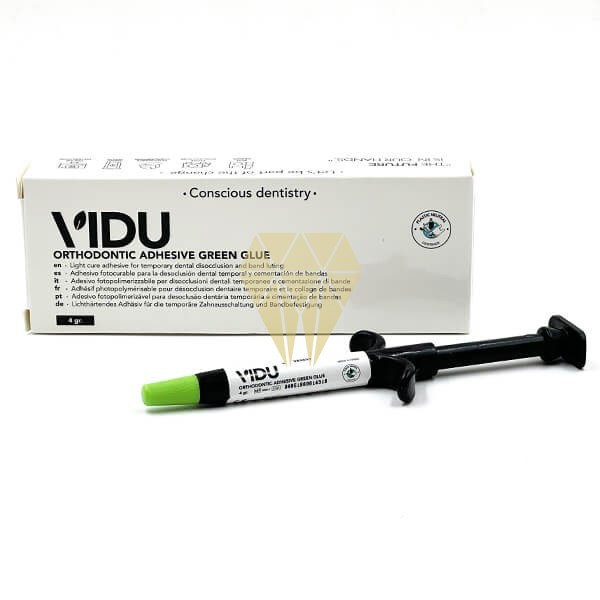 El adhesivo Green Glue de Vidu es un adhesivo ortodóntico que cambia de color, proporciona un tiempo de trabajo más largo y un tiempo de fraguado rápido. Se puede colocar directamente en bandas. El exceso de destello es fácil de limpiar antes del fotocurado y el cemento es fácil de ver debido al color verde.