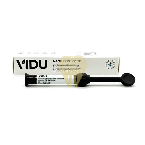 Composite universal nanohíbrido y fotopolimerizable de la marca VIDU. Es altamente estético y está indicado para numerosas restauraciones.