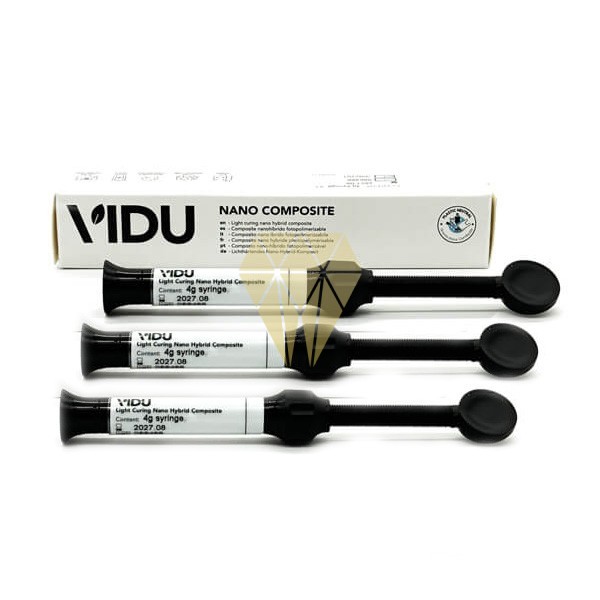 Composite universal nanohíbrido y fotopolimerizable de la marca VIDU. Es altamente estético y está indicado para numerosas restauraciones.