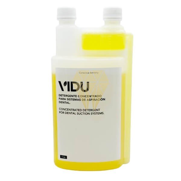 El Desinfectante Concentrado para Sistemas de Aspiración de Vidu se utiliza para realizar una profunda descontaminación en sistemas de aspiración dental. Características del Desinfectante para Sistemas de Aspiración Dental: - Desinfectante concentrado para sistemas de aspiración, separadores, escupideras y grupos hídricos. - Ideal para sistemas de succión de línea húmeda, seca y semi húmeda/ seca. - Sin espuma. - Efecto a partir de 60 segundos. - Bactericida, levuricida, fungicida y virucida. - 1 litro concentrado = 50 litros solución de trabajo. - Concentración desde 2% - 5 min. - Producto 3 en 1: Desinfección, limpieza y desodorización. - Contenido: 1 bote de 1 o 5 litros. - Propiedades Microbiológicas del Desinfectante: - Bactericida (5 min): Pseudomonas aeruginosa, Staphylococcus aureus, Enterococcus hirae. - Fungicida (15 min): Candida albicans, Aspergillus brasiliensis. - Levuricida (15 min): Candida albicans. - Virucida: Adenovirus tipo 5, Norovirus murino, Norovirus, Rotavirus, Adenovirus, Virus con envoltura (incl. HBV, HCV,HIV,CORONAVIRUS). DESINFECTANTE PARA SISTEMAS DE ASPIRACIÓN · PLASTIC NEUTRAL CERTIFIED · HUELLA DE PLÁSTICO CERO En el caso del desinfectante y el plástico generado por la misma, mientras VIDU trabaja en la investigación de soluciones alternativas que permitan mantener el producto en las condiciones necesarias, han llegado a un acuerdo con RePurpose, organización que ha desarrollado la mayor red certificada de proyectos de recogida de plástico en todo el mundo, según el cual recolecta a través del proyecto Nuevo Ciclo, en Colombia, la misma cantidad de plástico que la que generan.