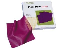 Flexidam.Dique realizado en nuevo material sin ltex para evitar alergias. Especialmente resistente al desgarro. Tiene muy buena capacidad de recuperacin y adhiere perfectamente al cuello del diente. No contiene talco, es inodoro y la caducidad es de 3 aos. Color violeta