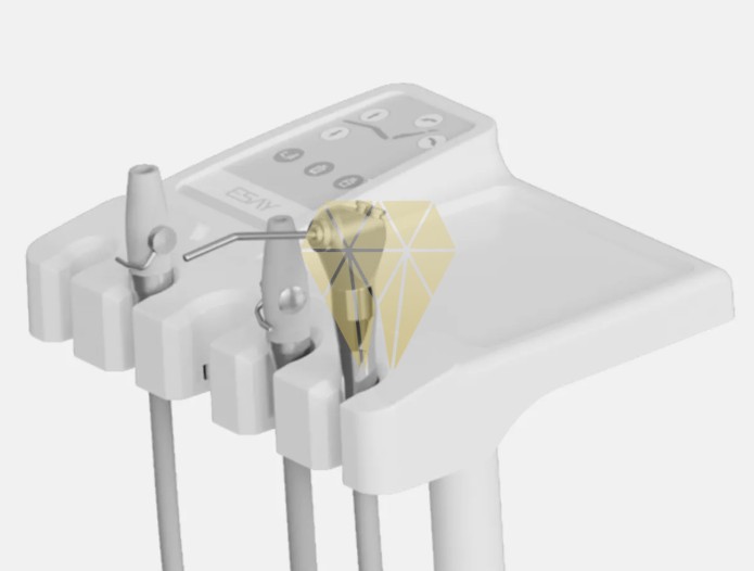 La bandeja del asistente puede girarse 180°, con espacio reservado para la lámpara de fotopolimerización. Su brazo giratorio aporta mayor flexibilidad para el trabajo a cuatro manos, facilitando la coordinación durante el procedimiento.