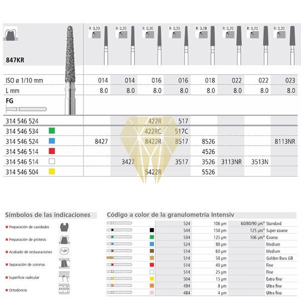 Fresas de diamante y carburo-tungsteno de alta calidad. Acabado muy uniforme, de bajo desgaste y duración muy superior a otras marcas (2-3 veces más). Eliminación de restos mejorado y optimas propiedades de enfriamiento. Tipos de Turbina, Contra-ángulo y Pieza de mano.Caja de 6 unidades.