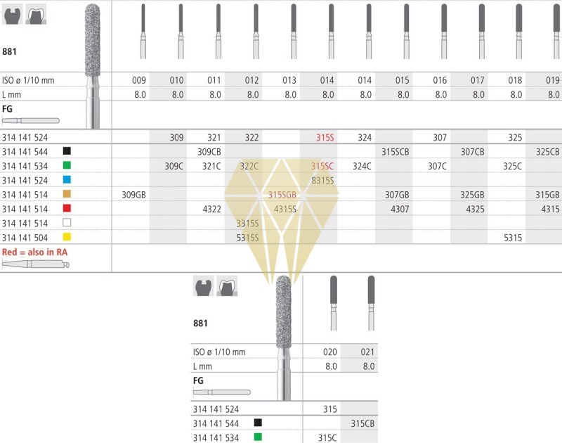 fresas de diamante y carburo-tungsteno de alta calidad. Acabado muy uniforme, de bajo desgaste y duración muy superior a otras marcas (2-3 veces más). Eliminación de restos mejorado y optimas propiedades de enfriamiento. Tipos de Turbina, Contra-ángulo y Pieza de mano.Caja de 6 unidades.