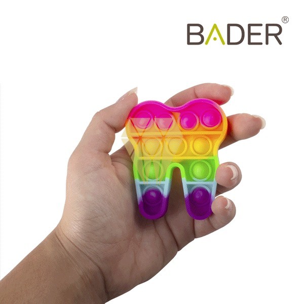 El Popitdent Bader es un divertido y práctico juguete antiestrés que incorpora diferentes colores y texturas, diseñado para estimular los sistemas visuales y táctiles. Su uso favorece el desarrollo sensorial y motor en la infancia, así como la socialización entre los más pequeños.