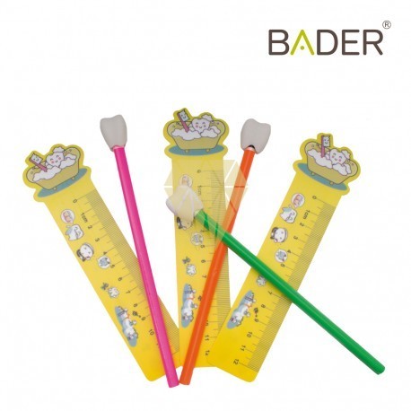 Regalo muy práctico compuesto por: lápiz, goma de borrar en forma de muela y regla con elementos odontológicos.