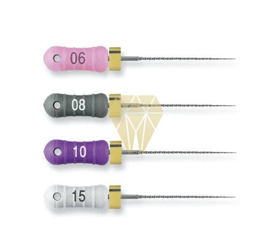 Limas C+ Dentsply para la instrumentacin inicial de los canales radiculares. Estos instrumentos con una resistencia a la torsin mucho más elevada que las limas convencionales facilitan la localizacin de los orificios canalares y el fácil acceso al tercio apical. La punta de sección piramidal facilita la insercin durante la cateterizacin. Marcas profundas en el instrumento permiten posicionar el tope de silicona con exactitud y es más fácil determinar la longitud trabajando con RX. La sección cuadrada ofrece mayor resistencia a la deformacin. Tres longitudes, 18, 21 y 25 mm, permiten óptima eficiencia en todos los casos clnicos. Presentadas en cajas con 6 unidades con 2 del n 08, 2 del n 10 y 2 del n 15.