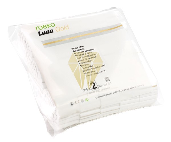 Luna Gold está recubierto por un material no tejido hipoalergénico que impide que las fibras entren en contacto directo con la mucosa del paciente. Luna Gold puede retirarse sin humidificación previa y evita reacciones de hipersensibilidad en la mucosa. La excelente calidad de Luna Gold se reconoce inmediatamente: su tira dorada permite distinguirlos de los rollos de ALGODON regulares.